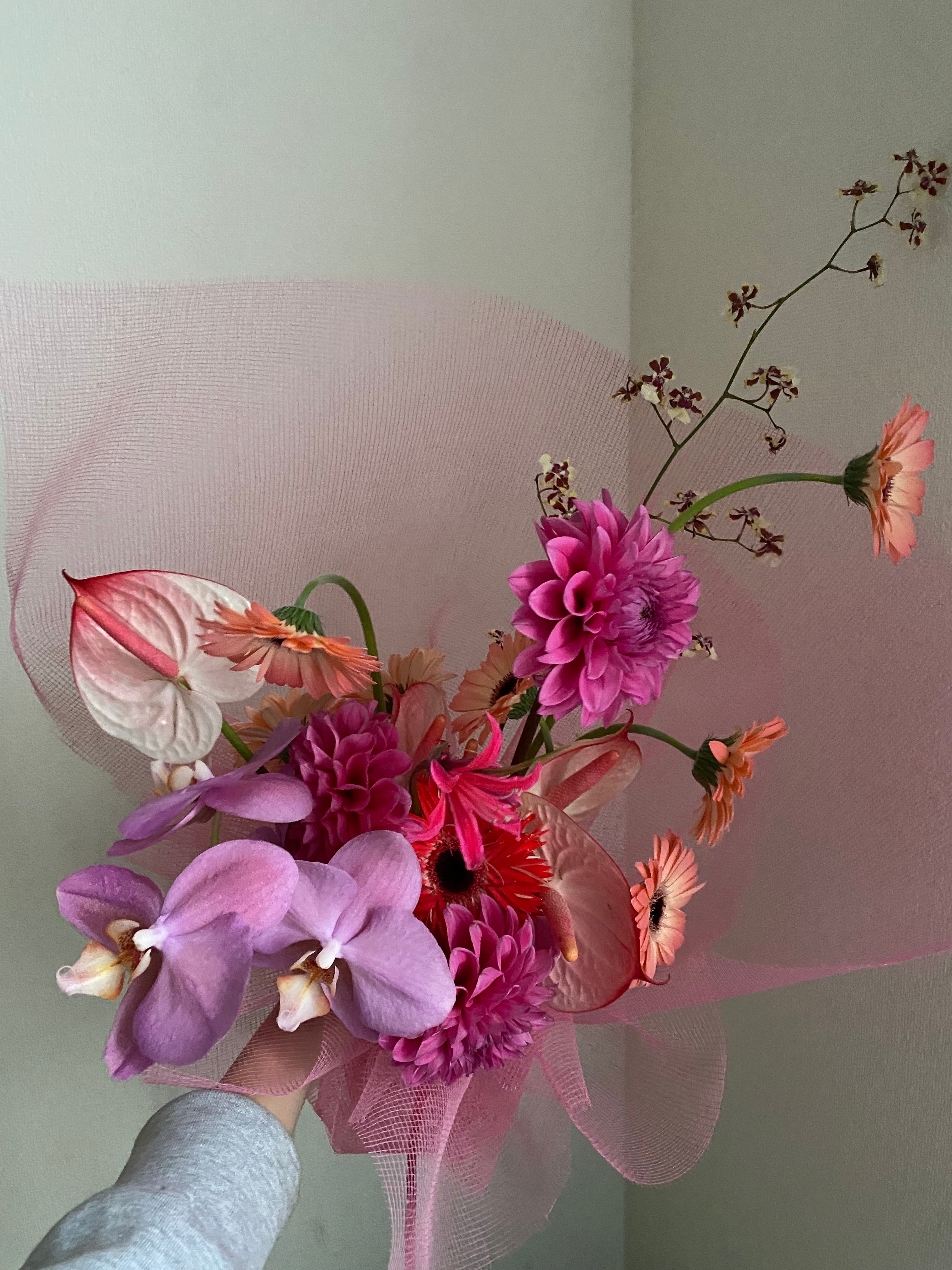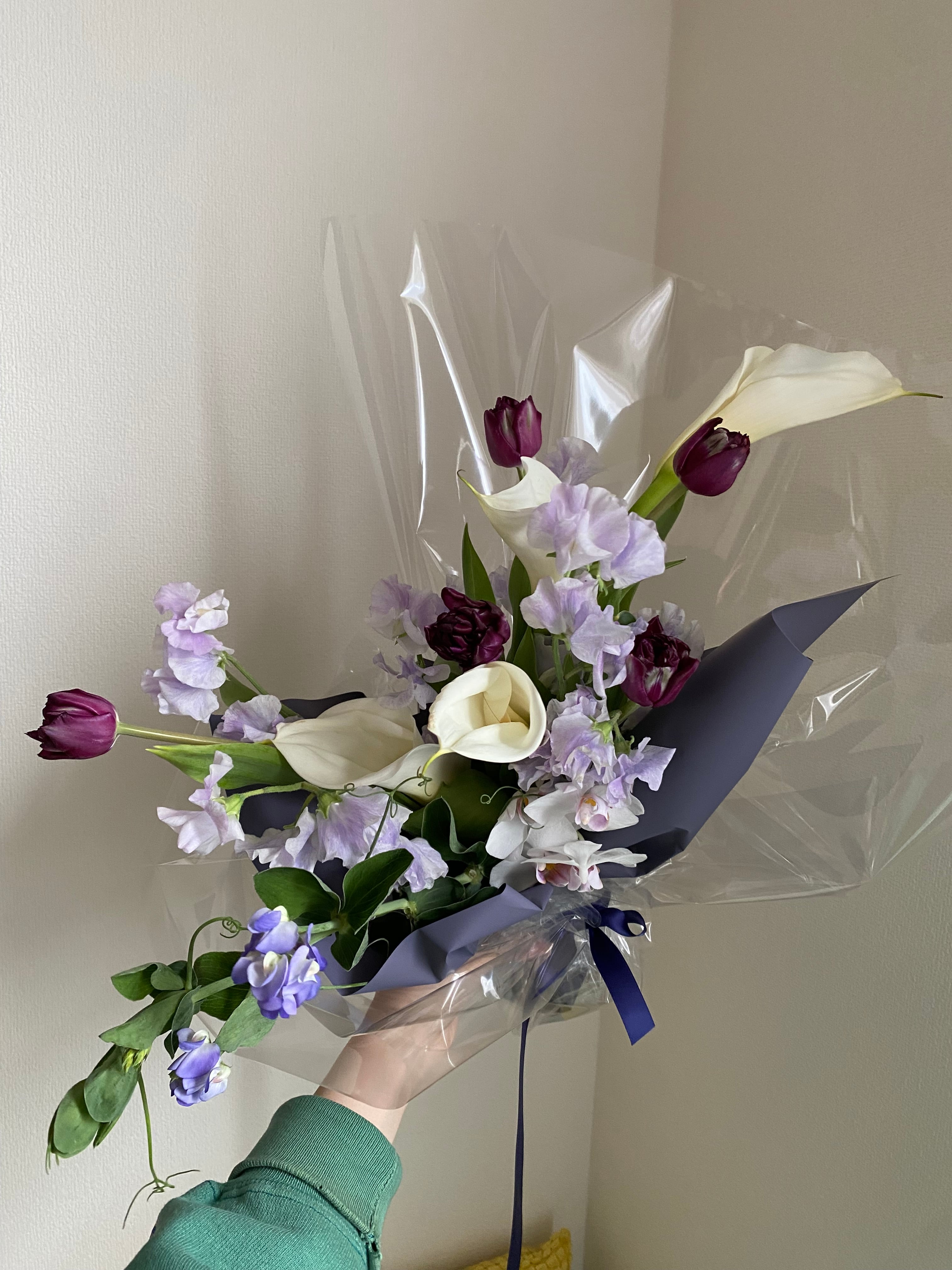 お母さま・パートナーのお人柄やお好きなもの、エピソードを汲み取りその時仕入れた季節のお花でお束ねいたします