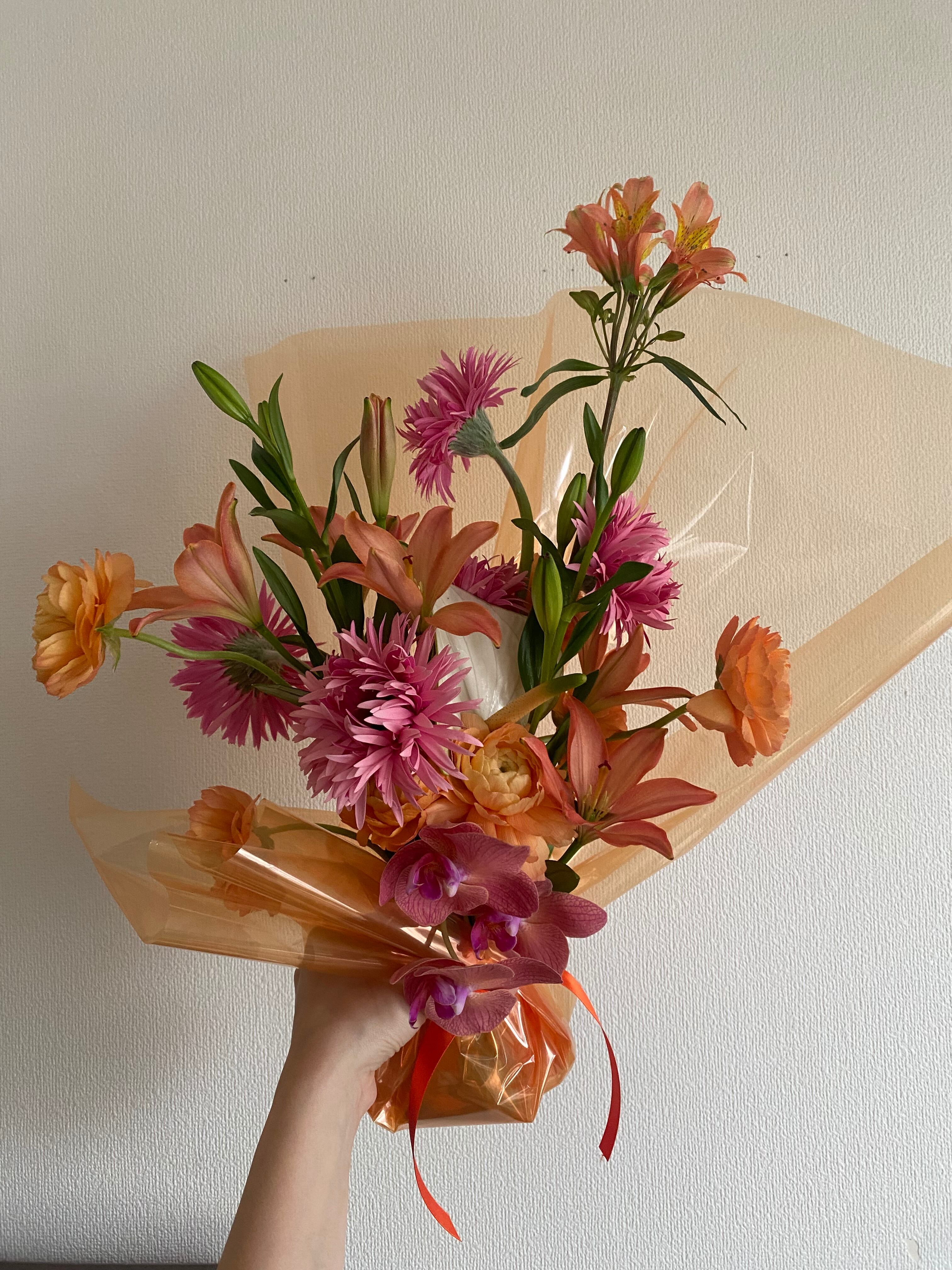 少し華やかさを残しつつ、お部屋で飾りやすいボリュームの花束